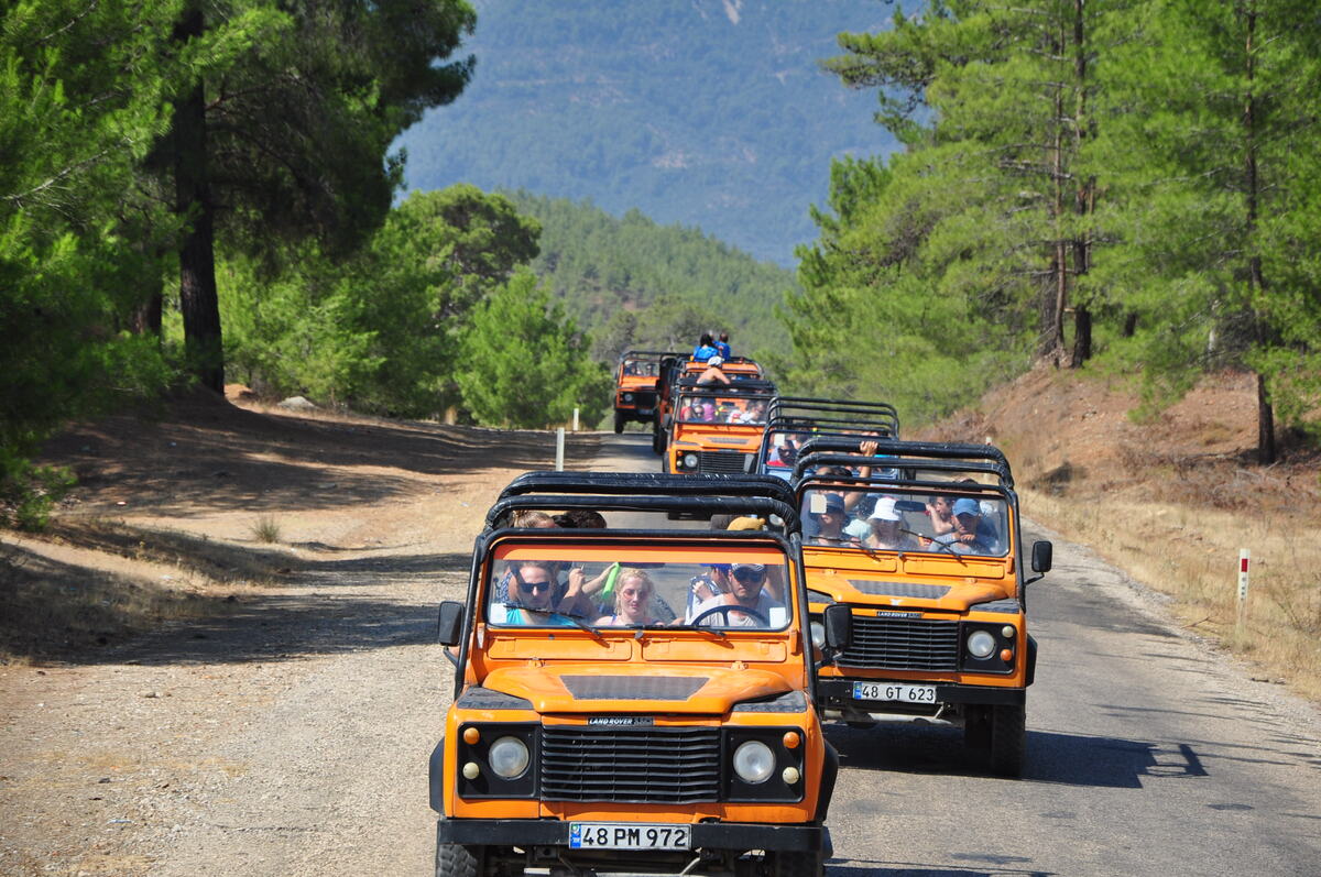 The tour begins with morning hotel pick-up and continues with an open-top safari experience in either a Land Rover Defender or an open-top Mercedes Sprinter. After meeting at the gathering point, the first stop is Gizlikent Waterfall for a short walk and photo break. Guests who wish can join the zipline activity for an extra charge. Lunch is then served with a choice of chicken or fish, together with pasta and salad. After lunch, guests enjoy around one hour at Saklikent Canyon, with the option to join rafting for an additional fee. The day continues with a fun mud bath stop before returning. Outside the highway sections, safari vehicles travel in convoy and guests enjoy the famous water fight throughout the journey.